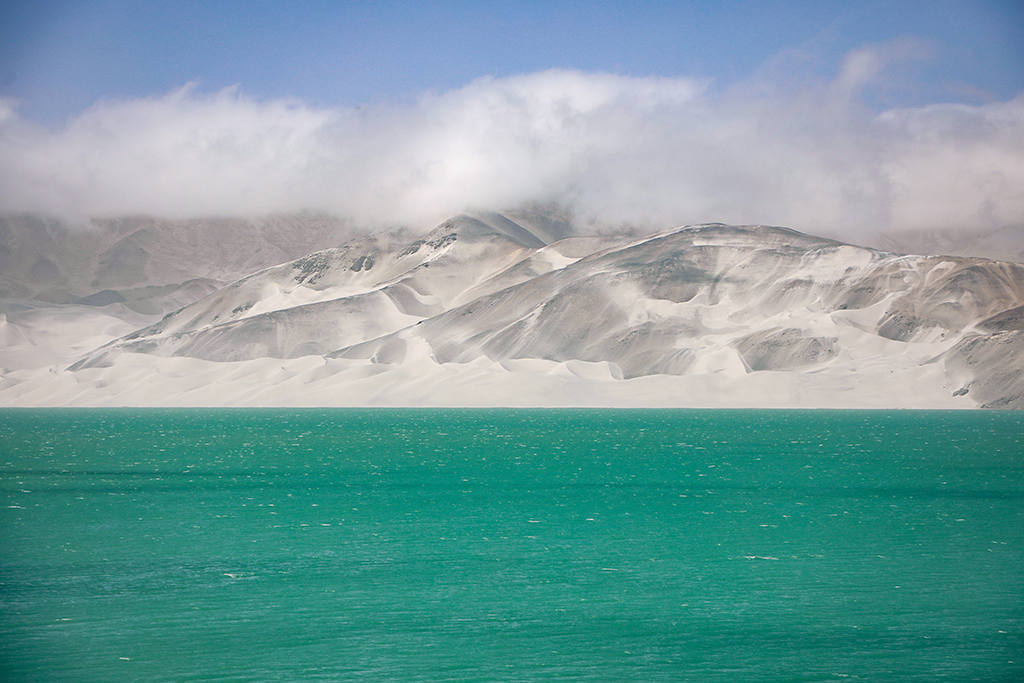 Covered with white sand, Baisha Mountain in Kashgar, Xinjiang Uygur autonomous region looks like a silver dragon lying on a rippling lake.