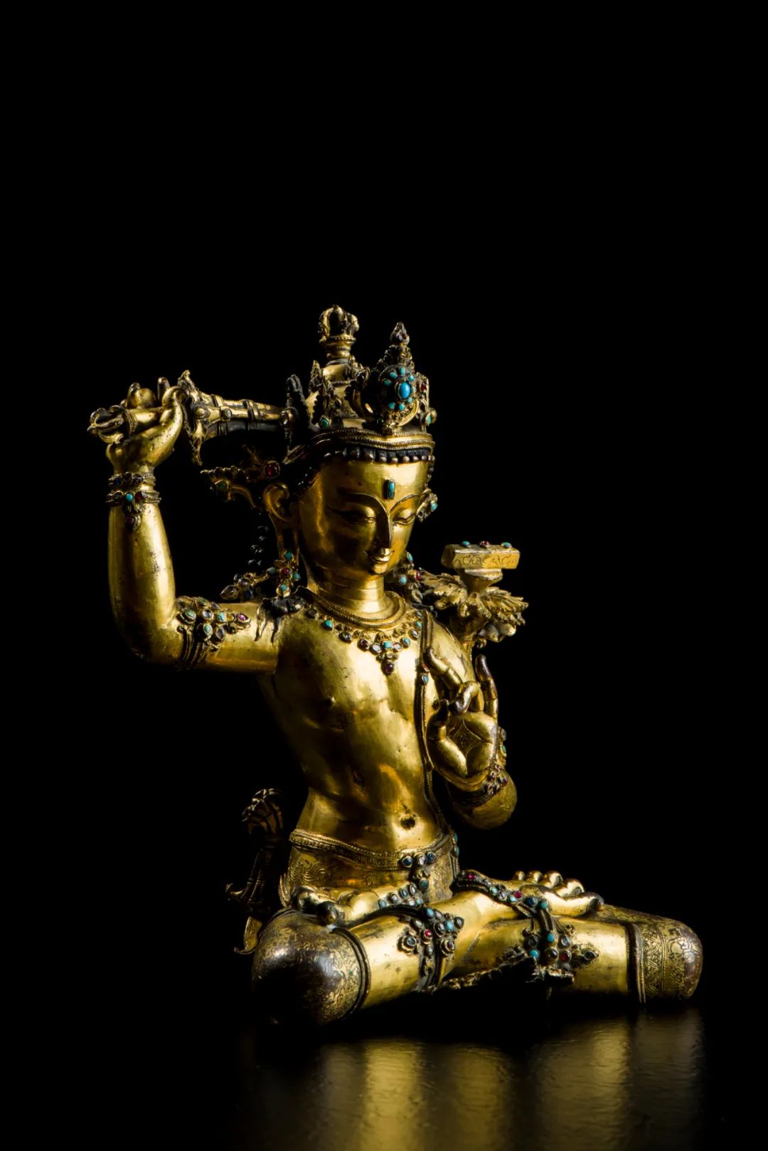 Gilded copper figure of Manjushri Buddhisattva with inlaid gems, from the Suixi Ancient Art[Photo/Official WeChat account of Guardian Art Center]