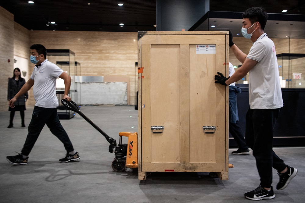 Museum staff carefully move a package containing the bell. [Photo/IC]