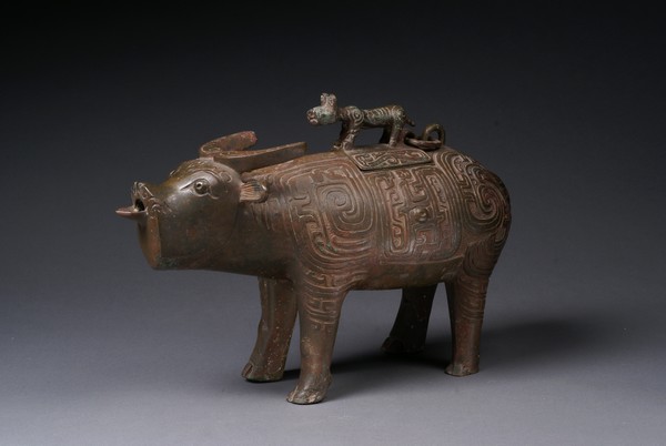 In addition, the Jia Goblet (wine warmer) with a pair of phoenix capped pillars, of the pre-Zhou Dynasty (c.11th century-256 BC), the Ox-shaped Zun Vessel (wine container), and the He Ewer (wine container) of Ta of the Western Zhou Dynasty (c.11th century-771 BC), the gourd-shaped pot with a bird-shaped lid, from the Warring States Period (475-221 BC), and the Painted Bronze Oil Lamp in the Shape of a Goose Carrying a Fish, from the Han Dynasty (206 BC-AD 220),are all of unique shapes and designs and are among the bronze collection of the Shaanxi History Museum.