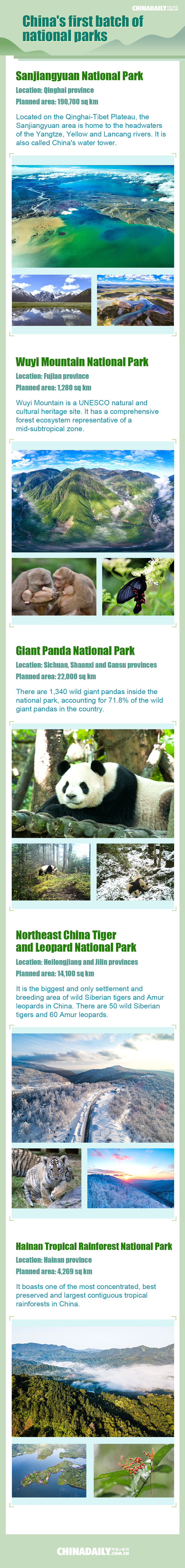 China has announced its first batch of national parks - Sanjiangyuan National Park, Wuyi Mountain National Park, Giant Panda National Park, Northeast China Tiger and Leopard National Park, and Hainan Tropical Rainforest National Park.