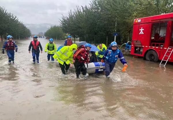 Rescuers transfer residents previously trapped due to heavy rain in the Jinyuan district of Taiyuan, North China's Shanxi province, on Oct 6, 2021. Heavy rains have caused floods and disasters in the province. [Photo/chinadaily.com.cn]