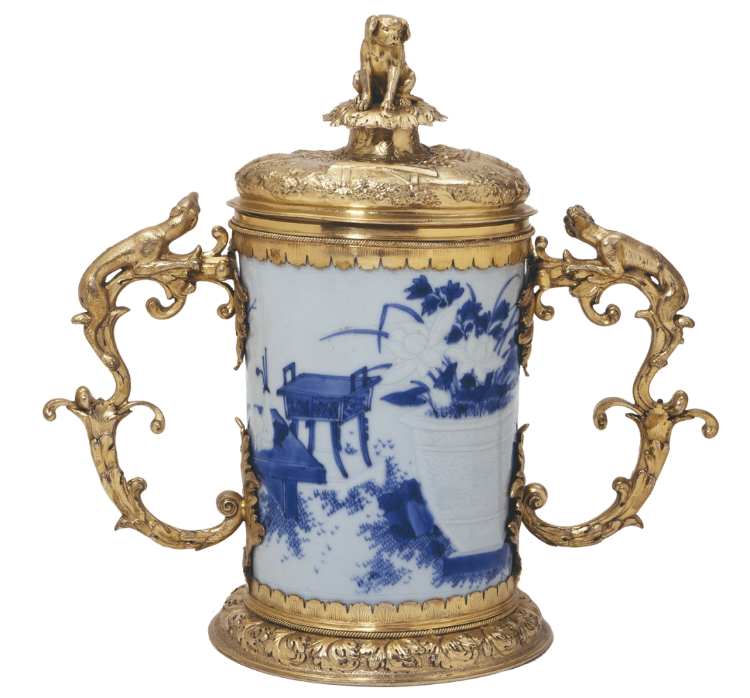 Blue-and-white covered mug transformed from a brush pot (inlaid and gilded in Britain around 1660 to 1670) , Jingdezhen ware, dated to the Chongzhen reign (1628-1644), from the collection of the Victoria and Albert Museum [Photo/Official WeChat account of Shanghai Museum]