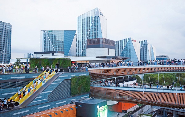 The project features a double-open park concept, a wide expanse of open green space and lanes across the ground level and rooftop, connected by an 80-meter-long scenic bridge overlooking the Huangpu River.