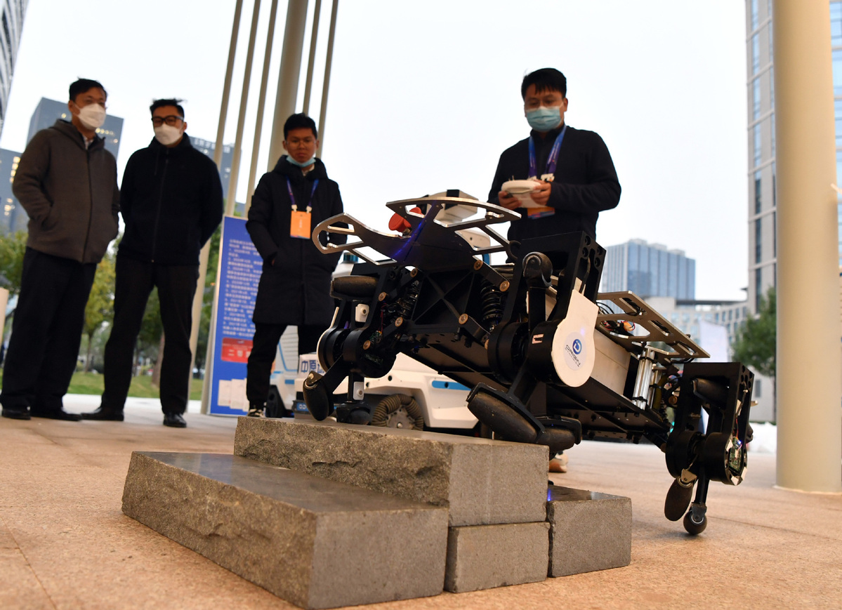 A man controls a robot at the main venue of the 2021 National Mass Innovation and Entrepreneurship Week in Zhengzhou, Henan province on Oct 19, 2021. [Photo/Xinhua]