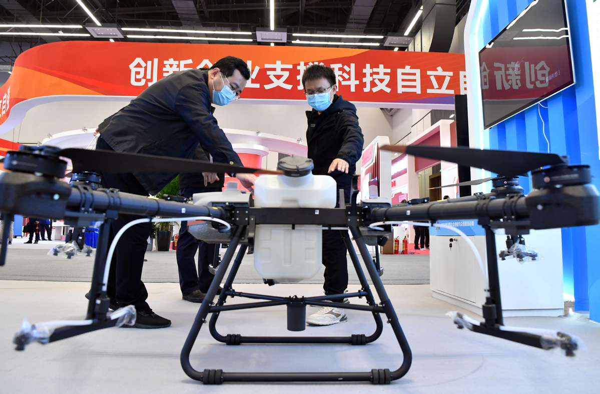 An agricultural drone at the main venue of the 2021 National Mass Innovation and Entrepreneurship Week. [Photo/Xinhua]