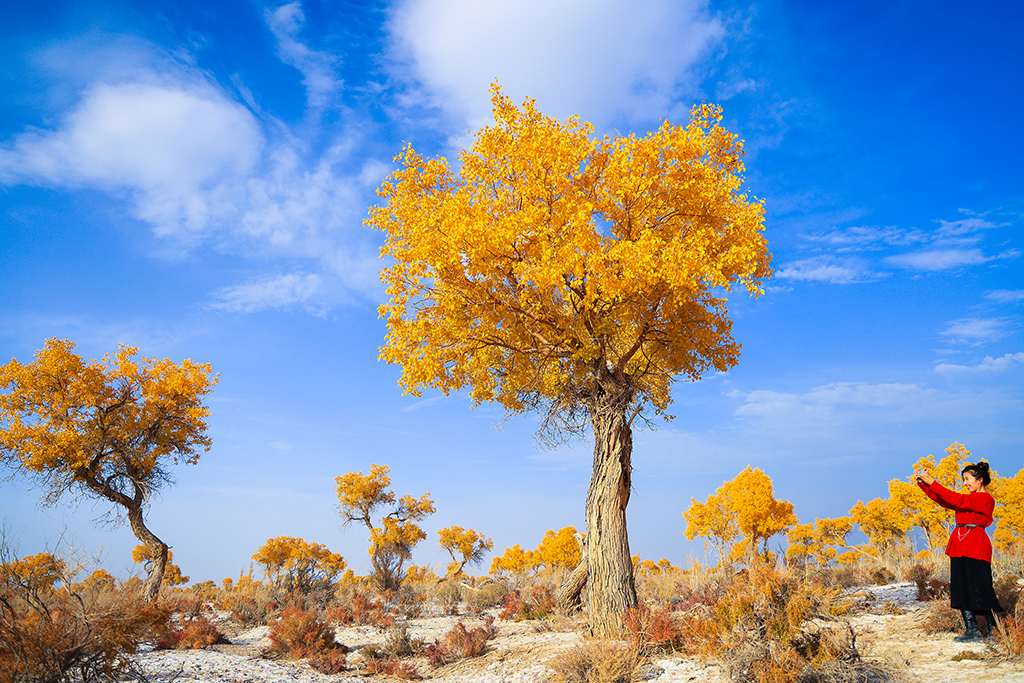 Yellow euphrates poplar forest in Xinjiang draws tourists