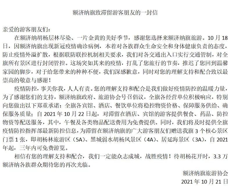 On Oct 21, the local tourism society in the Ejine Banner made the free ticket offer in an open letter.