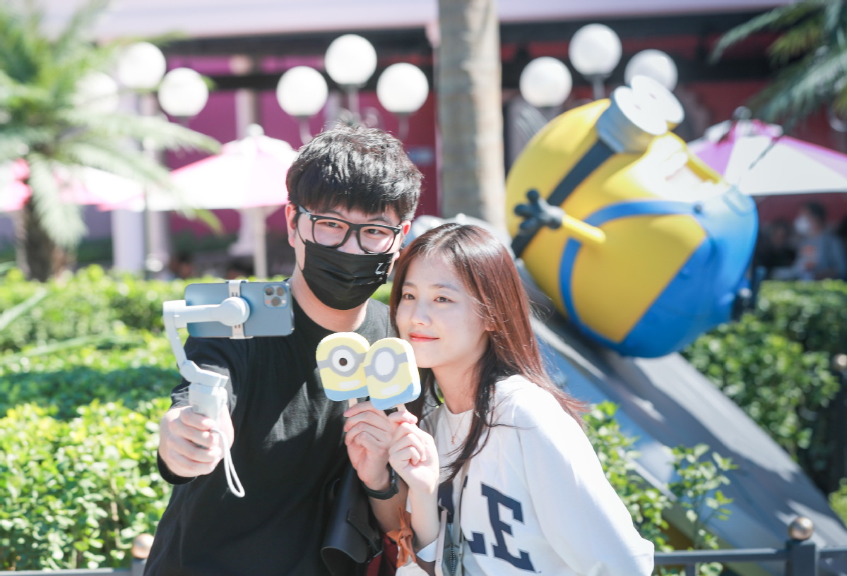 Tourists take selfies at the Universal Beijing Resort on Sept 21, 2021. [Photo/IC]