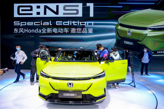 Visitors look at a Honda e:NS1 model at the Wuhan Motor Show. [Photo/IC]