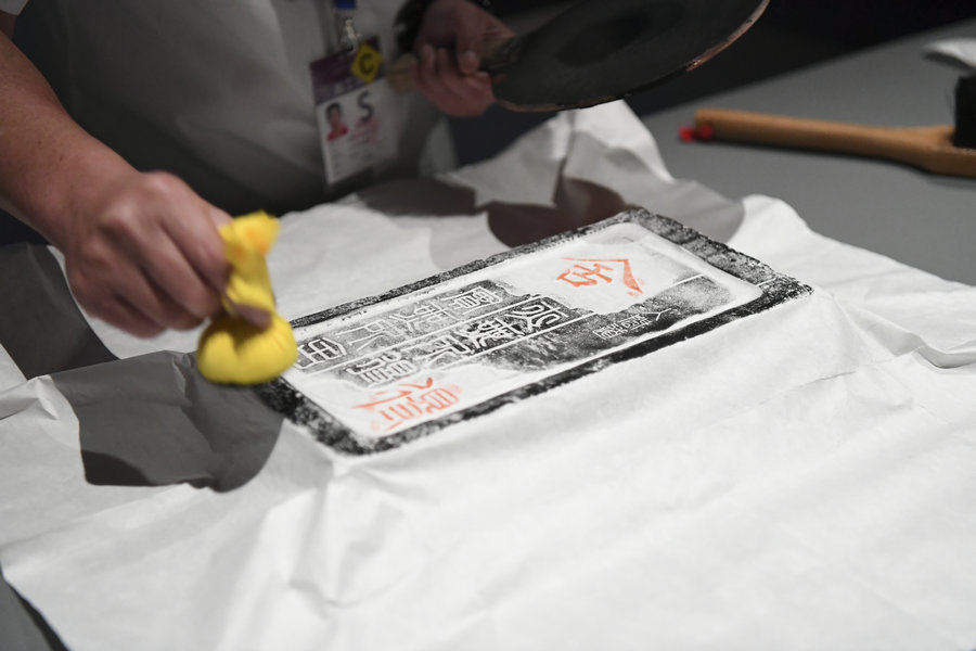 Staff members demonstrate how to make a tablet rubbing at the exhibition. [Photo by Yu Guanchen/For China Daily]