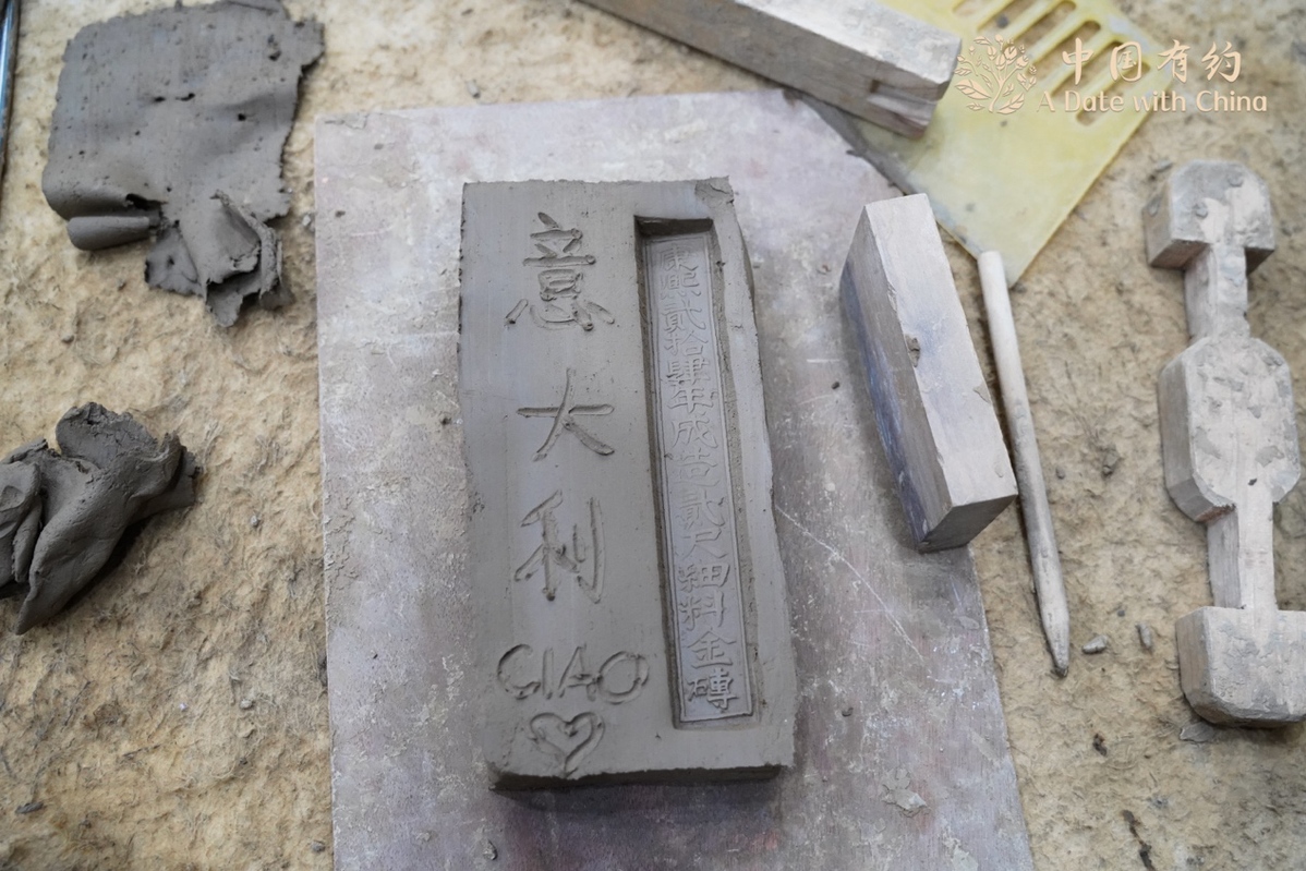 A kiln brick made by an Italian participant during the "A Date with China" international media tour at the Suzhou Museum of Imperial Kiln Brick in East China's Jiangsu province on Oct 25, 2021. [Photo/chinadaily.com.cn]