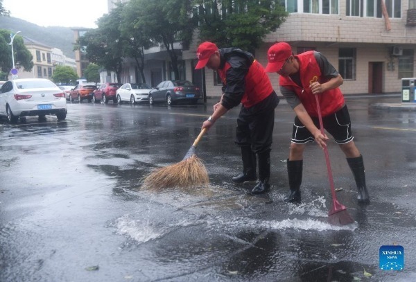 Volunteers clean a road in Zhoushan, East China's Zhejiang province, Sept 14, 2021. [Photo/Xinhua]
