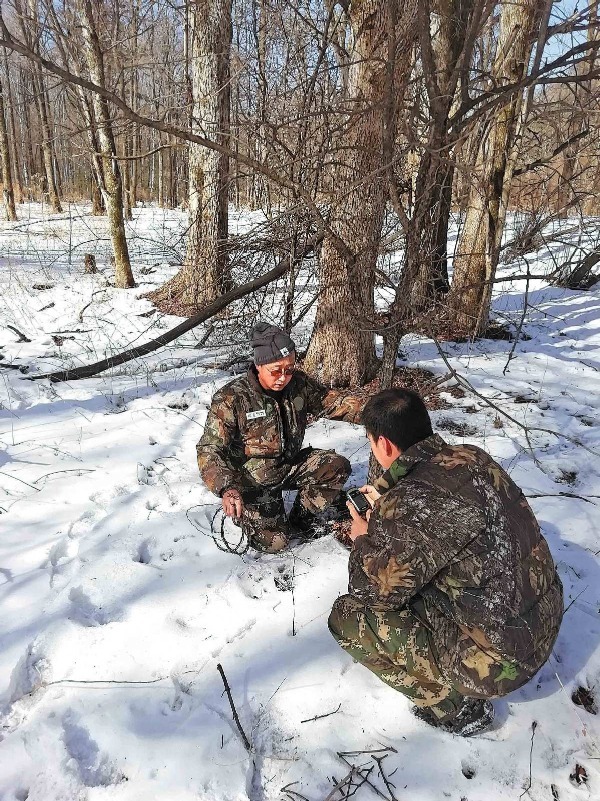 Walking an average of 15 kilometers each day, Wan's main duty is to find and record the tracks of endangered species, as well as removing traps placed to catch them. "We usually set out for the forest at 7 am and return at around 4 pm," he said. "It's so cold in the winter up here in Northeast China that we have to defrost our lunch in the car after work."