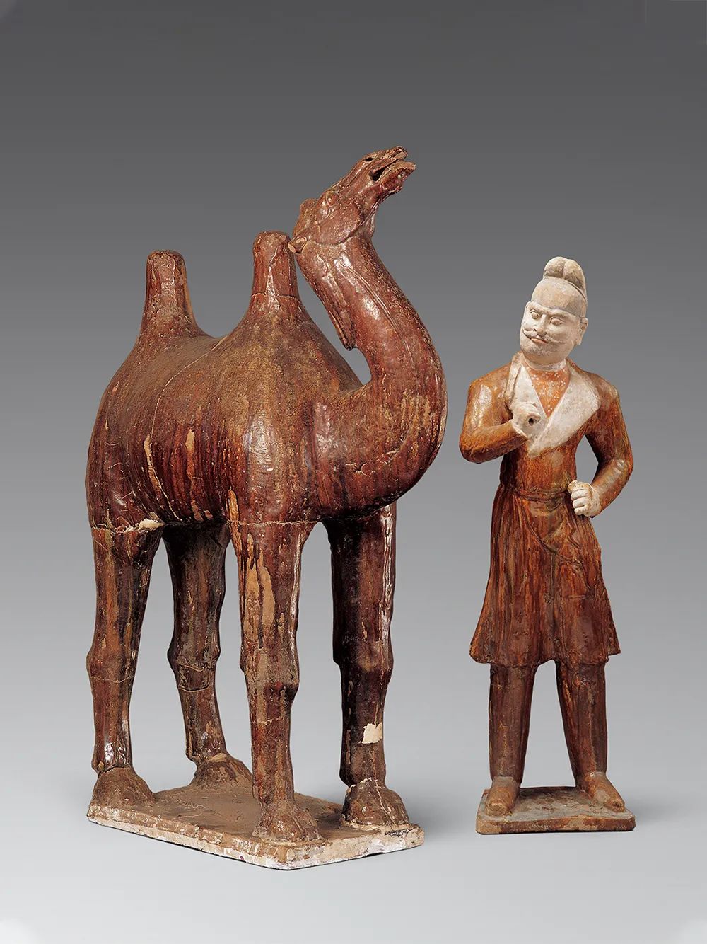 Glazed pottery figurines of a Central Asian merchant and a camel, Tang Dynasty (618-907), from the collection of the Gansu Museum [Photo/Official WeChat account of Guangdong Museum]