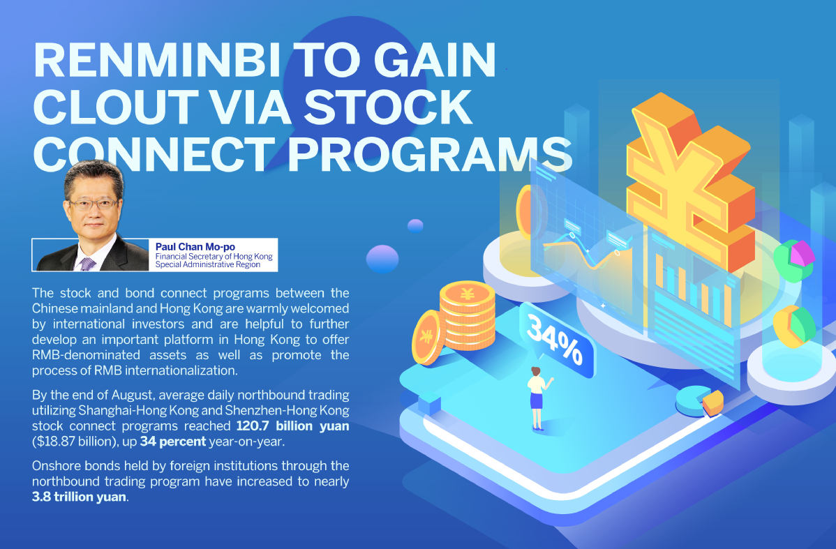 The stock and bond connect programs between the Chinese mainland and Hong Kong are warmly welcomed by international investors and are helpful to further develop an important platform in Hong Kong to offer RMB-denominated assets as well as promote the process of RMB internationalization, according to Hong Kong Financial Secretary Paul Chan Mo-po.