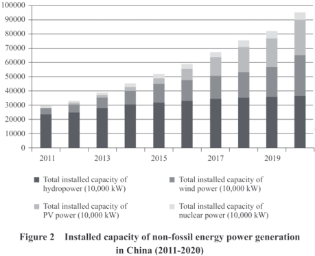 Non-fossil energy is developing rapidly. China gives priority to the development of non-fossil energy. It is vigorously developing and utilizing alternative energy sources, and promoting a green and low-carbon transformation of its energy industry. Preliminary calculations show that in 2020, non-fossil energy contributed 15.9 percent to China's total energy consumption, a significant increase of 8.5 percentage points compared with 2005. The total installed capacity of non-fossil energy power generation in China reached 980 million kW, accounting for 44.7 percent of total installed capacity. Within this figure, wind represented 280 million kW, PV 250 million kW, hydro 370 million kW, biomass 29.52 million kW, and nuclear power 49.89 million kW. PV power increased by a factor of more than 3,000 compared with 2005, and wind by a factor of more than 200. Electricity generated by non-fossil energy reached 2.6 trillion kWh, representing more than one third of the power consumption of the country.
