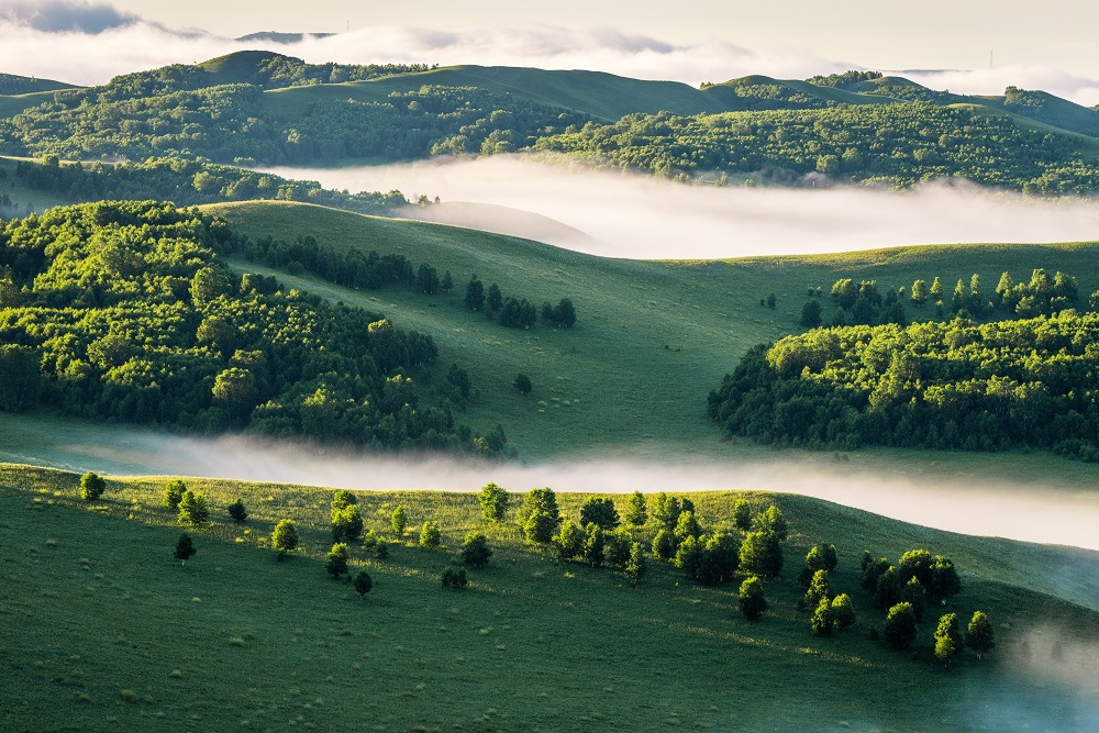 Morning mist blankets a corner of the Ulan Butung Grasslands in autumn. [Photos/IC]