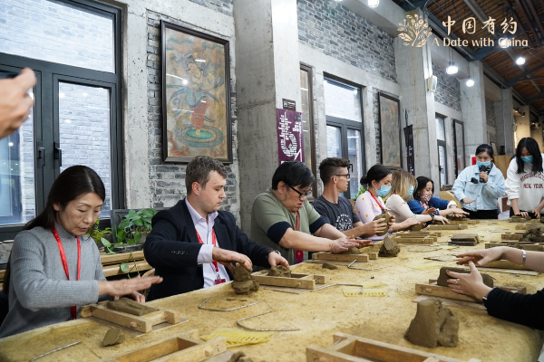 China-based foreign media correspondents and foreign internet influencers experience kiln brick making at the Suzhou Museum of Imperial Kiln Brick in East China's Jiangsu province on Oct 25, 2021. [Photo/chinadaily.com.cn]