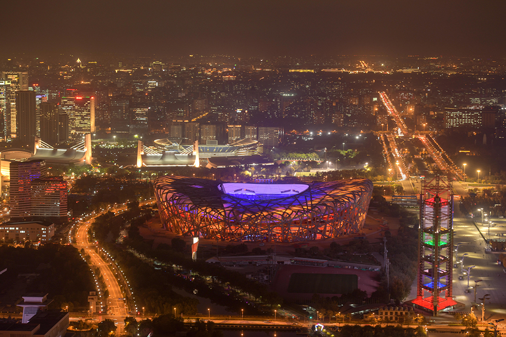 The National Stadium, also known as the 'Bird’s Nest', is lit up at night. [Photo/IC]