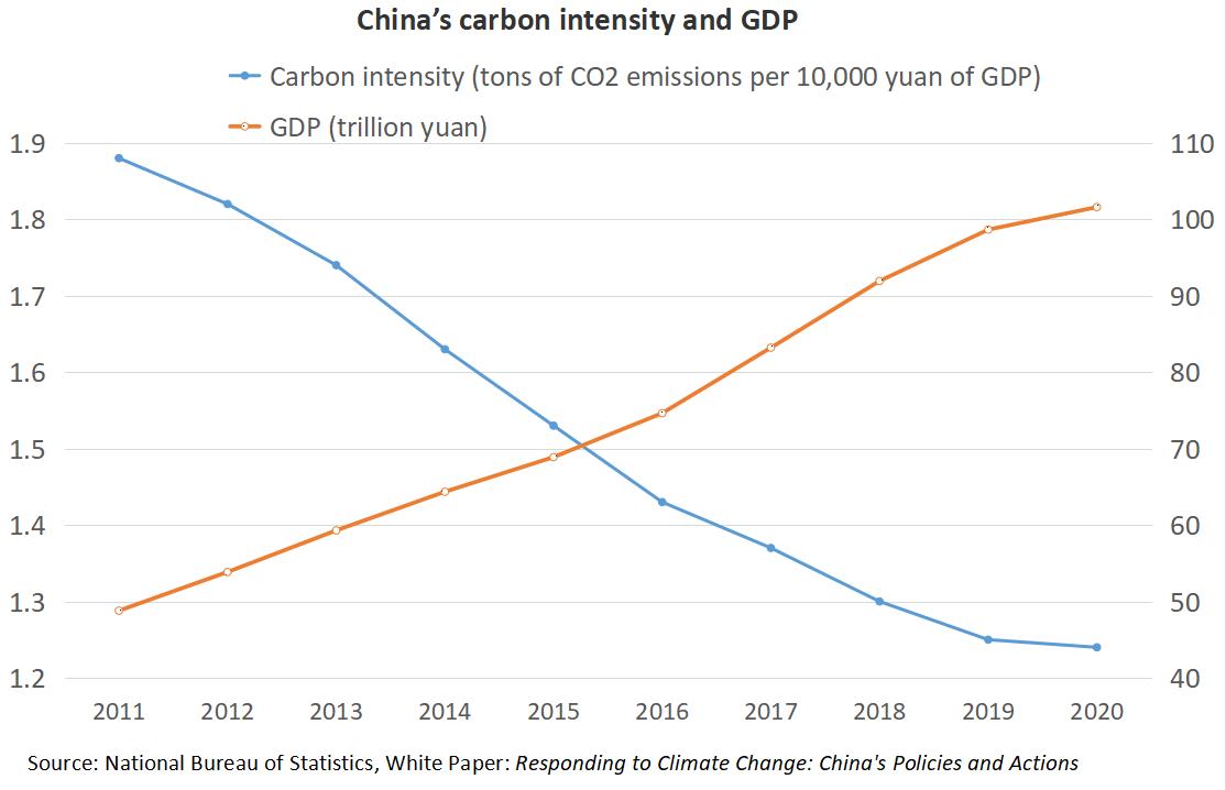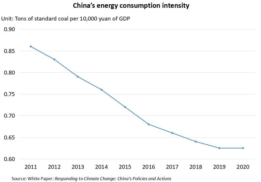 China has also been rapidly reducing its energy consumption intensity. From 2011 to 2020, it has cut energy consumption intensity by 28.7 percent, one of the fastest in the world.