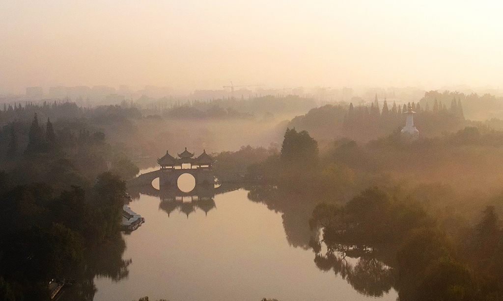 A morning view of Slender West Lake shrouded by mist in Yangzhou, East China’s Jiangsu province [Photo/IC]