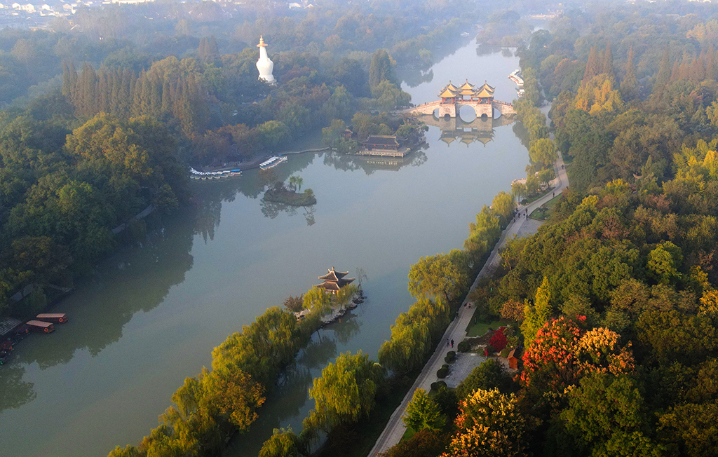 Slender West Lake seen from above complements the Wuting Bridge and a white pagoda in Yangzhou, East China’s Jiangsu province [Photo/IC]