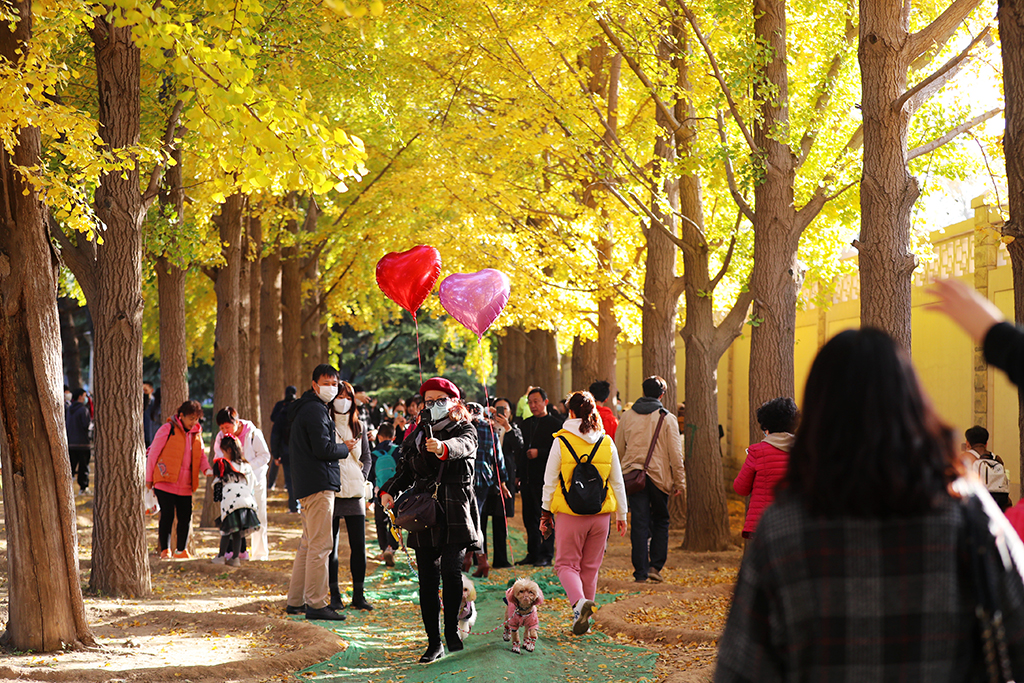 The 'ginkgo avenue' outside the Diaoyutai State Guesthouse in Beijing draws many visitors to take photos. [Photo/IC]