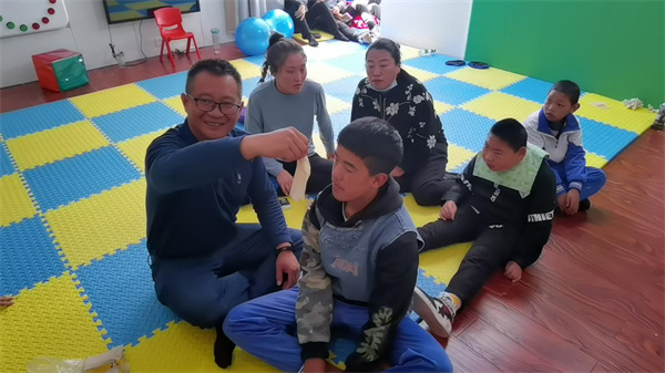Cao Longjun, an associate professor of the Tianjin University of Sport, trains a child with sports aphasia. [Photo provided to chinadaily.com.cn]