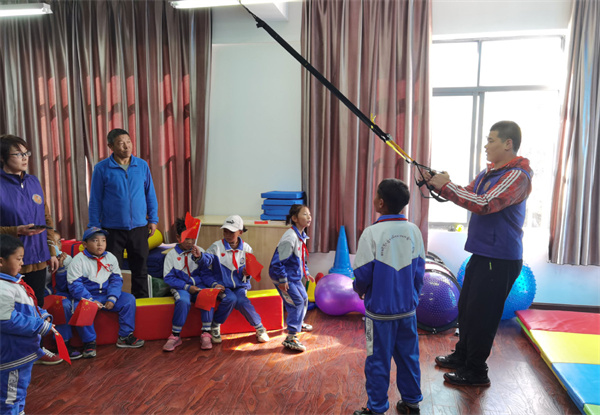 He Jihua, a graduate of the Tianjin University of Sport and an instructor at the physical rehabilitation training center in Tibet's Chamdo city, holds a physical training class for disabled students. [Photo provided to chinadaily.com.cn]