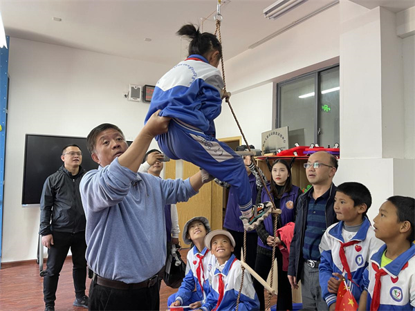 Wang Jian, a professor at the school of Social Sports and Health Sciences of the Tianjin University of Sport, trains a child with ladder climbing. [Photo provided to chinadaily.com.cn]