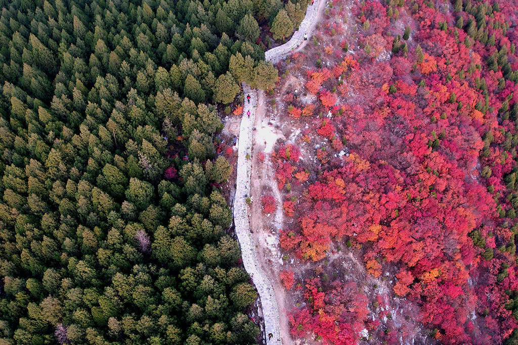 Check out these aerial views of Xiezi Mountain in Jinan, East China’s Shandong province! Southern smoke trees on the mountain are “dyed” red in late autumn, while northern pine trees are green all year-round.