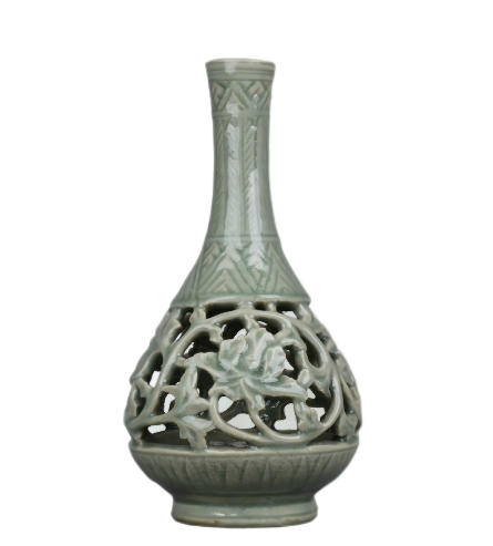 Celadon "yuhuchun"vase with openwork featuring interlocked peonies, Longquan ware, Ming Dynasty (1368-1644), from the collection of the Guangzhou Museum [Photo/Official WeChat account of Guangzhou Museum]