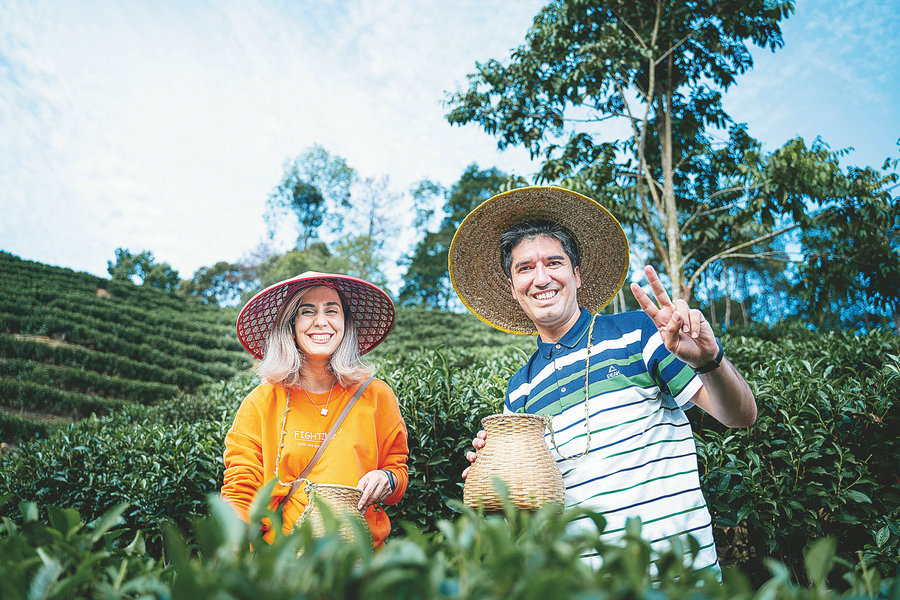 A couple from Iran pick tea leaves at a tea garden in Liubao, whose tea is considered one of the best in the country and was served in tribute to Emperor Jiaqing during the Qing Dynasty (1644-1911). [Photo provided to China Daily]