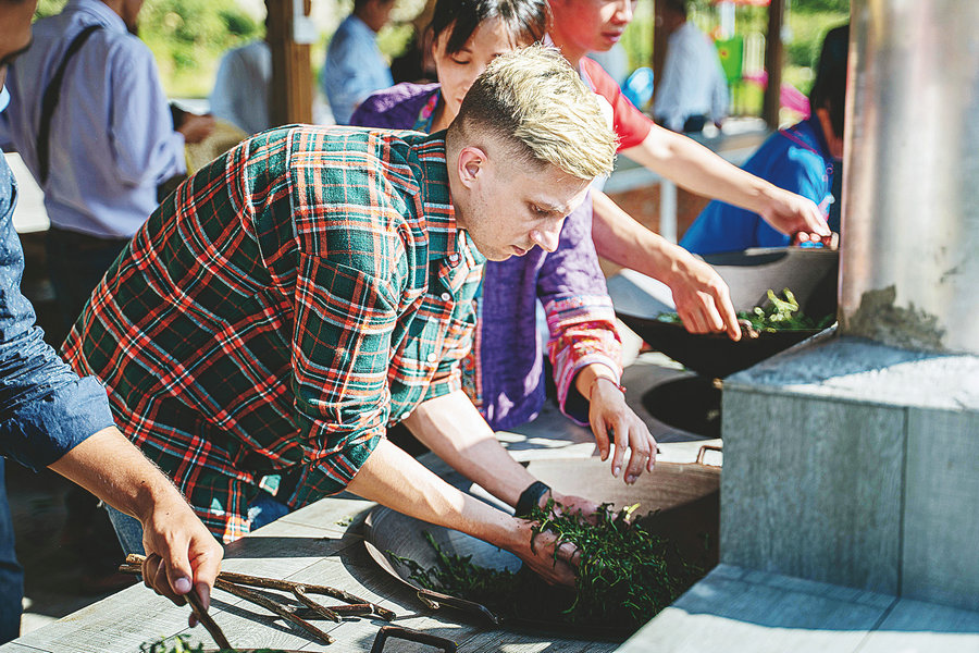 A visitor from Ukraine stir-fries tea in Liubao town, Guangxi Zhuang autonomous region [Photo provided to China Daily]