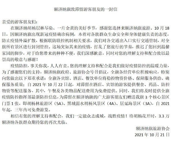 On Thursday, the local tourism society in the Ejine Banner made the free ticket offer in an open letter.