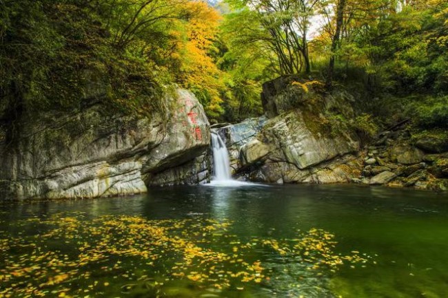 Leaves fall onto the water in Tangjiahe. [Photo by Liu Taiquan]