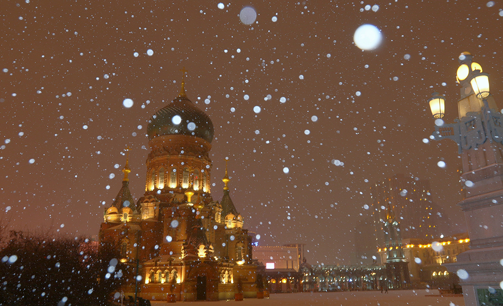 The snow-covered Saint Sophia Cathedral in Harbin, Northeast China’s Heilongjiang province looks charming at night. [Photo/IC]