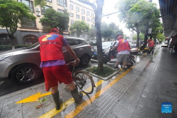 Volunteers lift up bikes in Zhoushan, East China's Zhejiang province, Sept 14, 2021. [Photo/Xinhua]