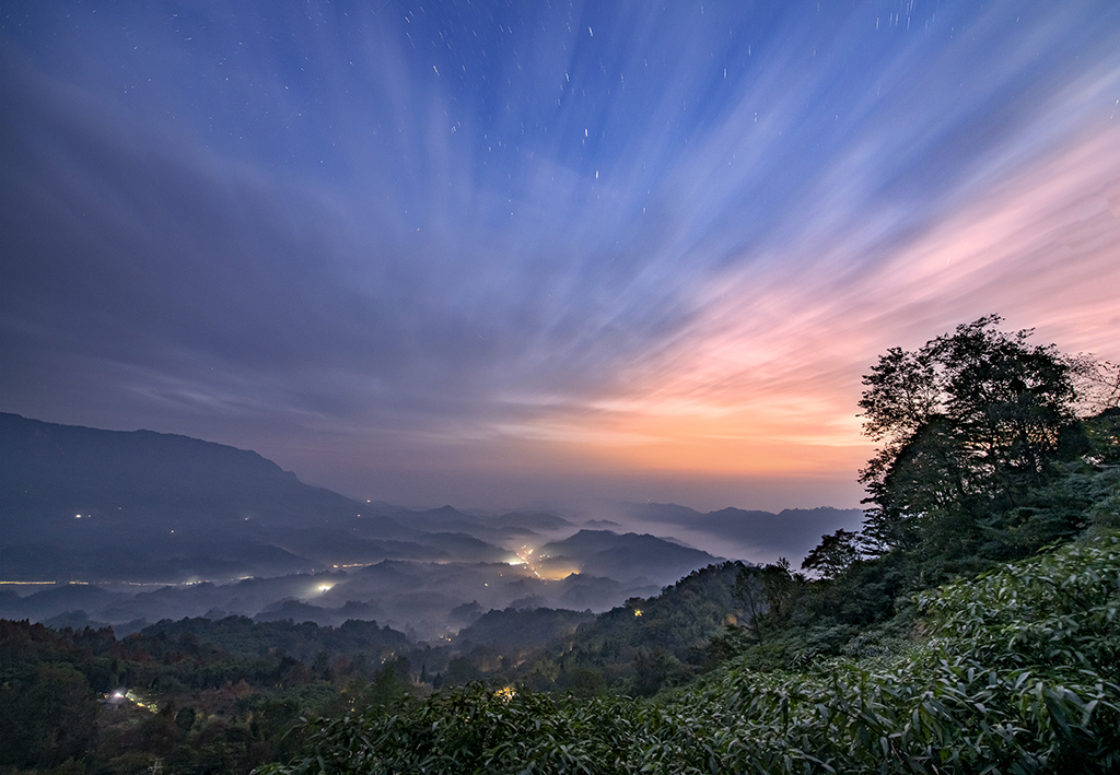 A starry sky and morning sunglow appear at the same time in Jiaguan town, Chengdu, Southwest China’s Sichuan province. [Photo/IC]