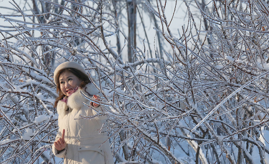 A woman poses for a photo with icicles on the trees. [Photo/IC]