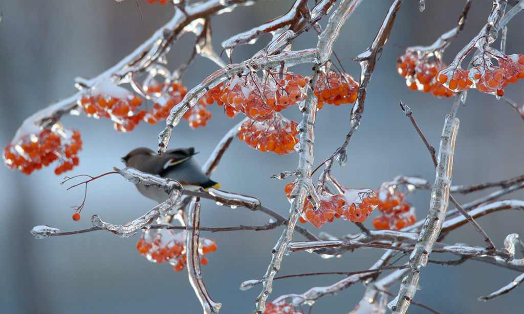 A bird perches on a twig coated in ice. [Photo/IC]