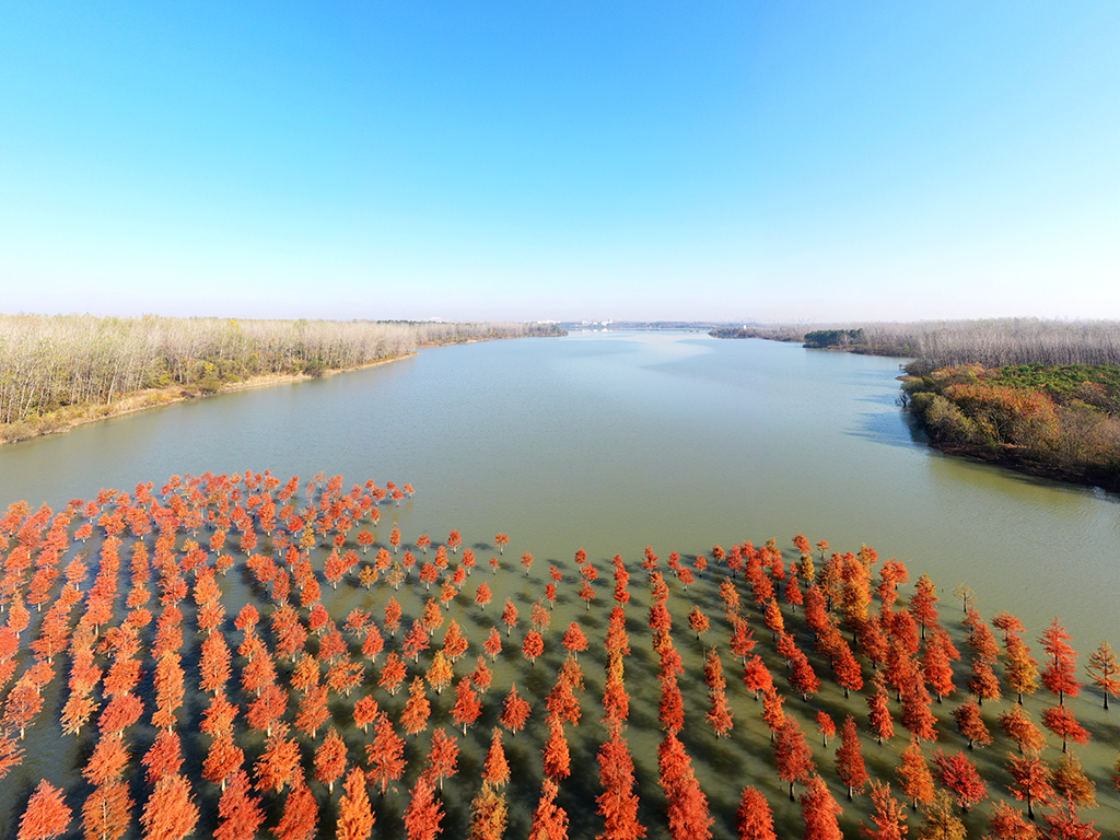 In early winter, colorful dawn redwood trees in the Dongpu Reservoir, Hefei, capital of East China’s Anhui province complement the azure sky and green water, forming a gorgeous ecological landscape.