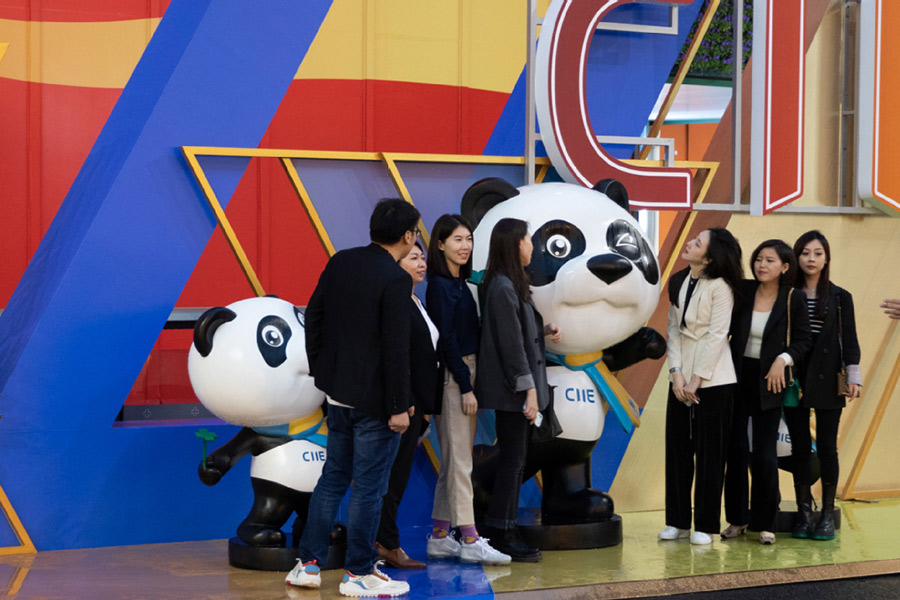 Visitors take photos with Jinbao, mascot of the China International Import Expo (CIIE) in Shanghai, Nov 5, 2021. [Photo/Xinhua]