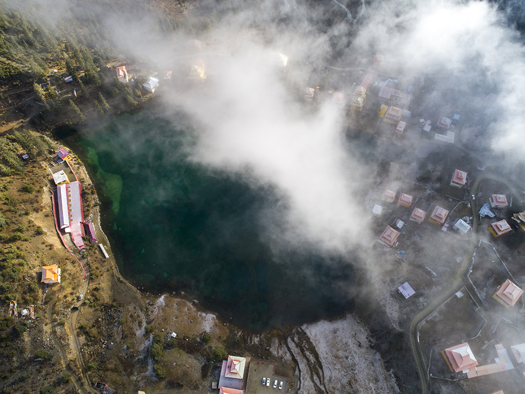 An aerial view of Cuoka Lake shrouded by mist [Photo/IC]
