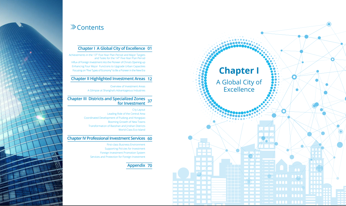 The 2021 Investment Guide reviews the economic accomplishments in the 13th Five-Year Plan period and makes comprehensive analyses on economic transformation as well as industrial optimization that will take place in the 14th Five-Year Plan period. Based on the "3+6" development strategies of the manufacturing sectors during the 14th Five-Year Plan period, it also presents all-round analyses on investment edges, mapping of industrial chains, supporting policies as well as exemplary cases in the 3 leading industries namely IC, biopharmaceuticals and AI as well as the 6 key industries namely electronic information, health care, automobiles, new materials, high-end equipment and modern consumables, providing necessary information for foreign-invested enterprises to invest in Shanghai.