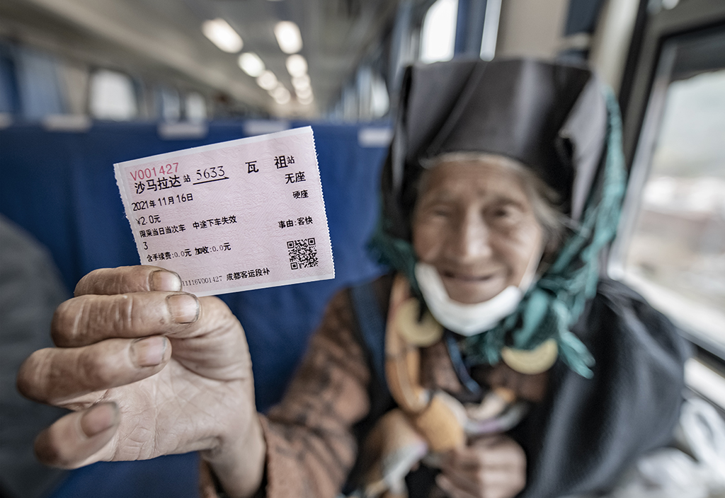 An old woman displays her train ticket. [Photo/IC]