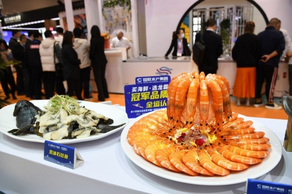Shrimps and fish dishes are displayed at the 25th China Fisheries and Seafood Expo in Qingdao, East China's Shandong province, on Oct 28, 2021. [Photo/Xinhua]