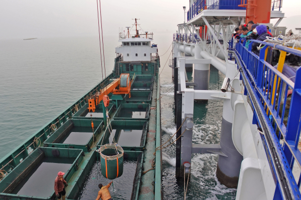 Workers load fish onto a boat at the "Genghai No 1" marine ranch complex in Yantai, Shandong province on Oct 26. [Photo/VCG]