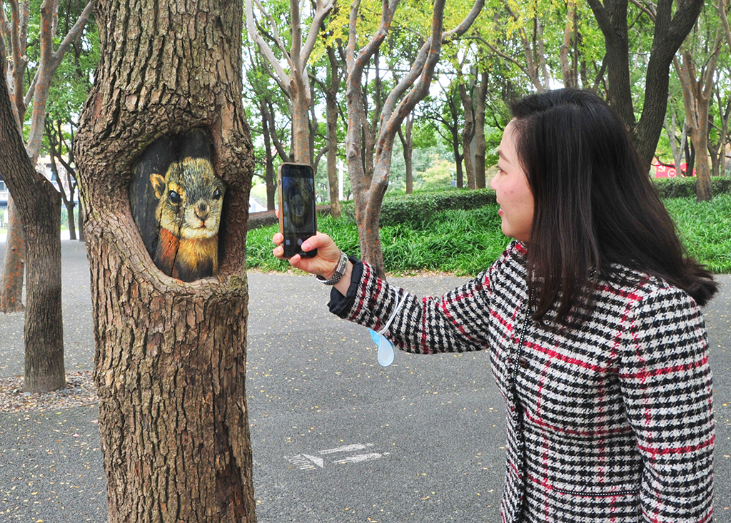 A passerby takes photos of a squirrel painted in a tree hole in Shanghai. [Photo/IC]